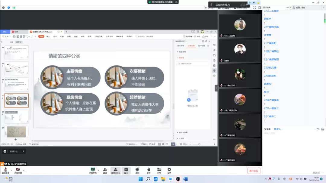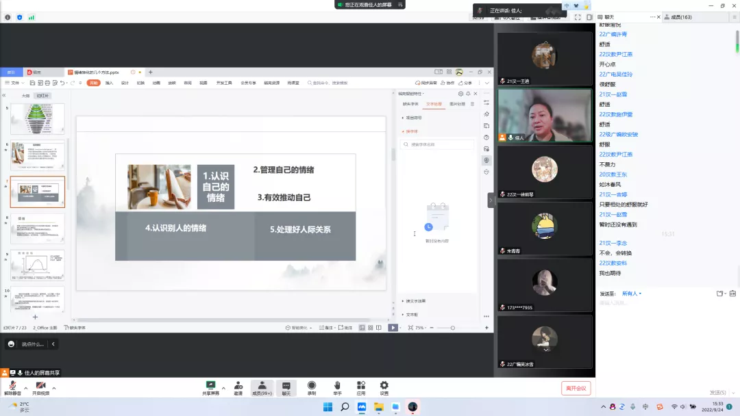 刘老师以鲁米的诗歌《客房》为例,和同学们探讨了情绪转化的几个小技巧。她指出,情绪就像一位来自远方的向导,滋养着我们认识更好的自己,情绪的自我调节对我们来说十分重要。通过识别自己和他人情绪的不同状态,有利于我们学会接纳自己。她强调,同学们在配合防疫工作和学习的过程中,也应该多多聆听自己的情绪,找到转化情绪的小技巧。面对这场人类历史上的重大挑战,我们更要积极乐观、健康向上!