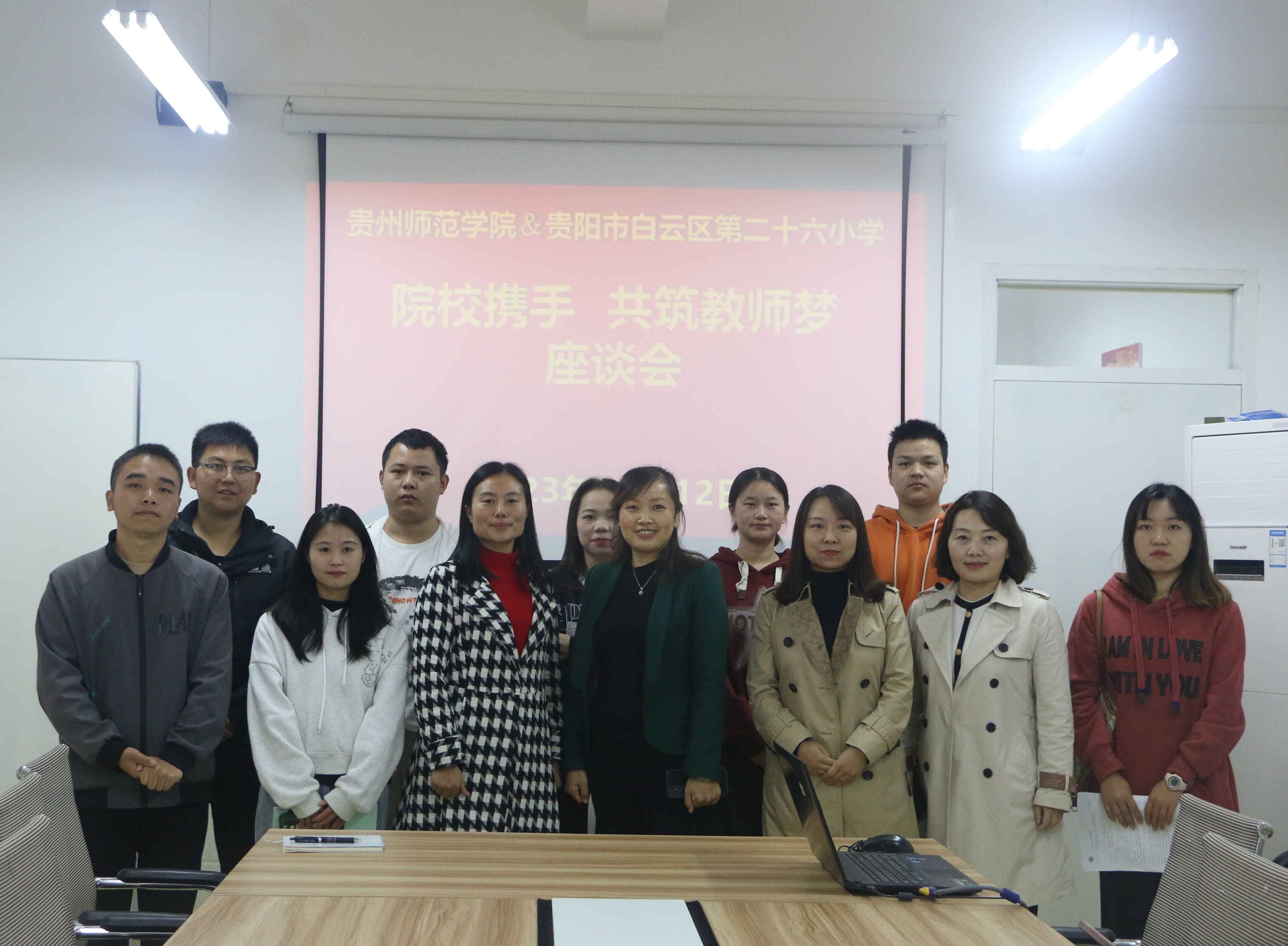 2023年10月12日,yl8858永利集团党委副书记陈亦桥、副院长陈欣、团委书记蹇登绯赴贵阳市第二十六小学和北京市日坛中学(贵阳分校)开展2024届师范专业毕业生中期检查工作,白云区第二十六小学小学校长曹俊卿、北京日坛中学(贵阳分校)党委副书记蒋惠、副校长郑丹、实习生指导教师及全体实习生参加座谈。