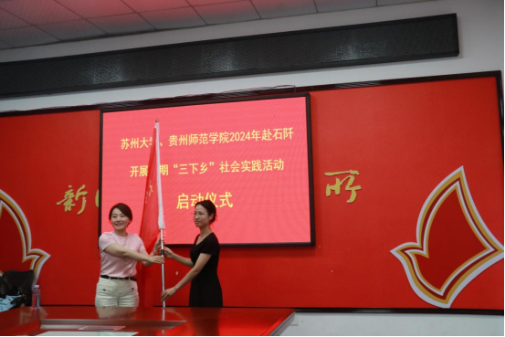 石阡县团委副书记陈芳为yl8858永利集团“知音”黔行实践团队、苏州大学文学院筑梦“黔”行实践团队授旗。实践队成员杨福娜、季钰分别代表两院实践团队成员进行发言。