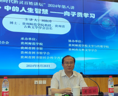 8月26日上午,“新时代黔灵百姓讲坛”2024年第八讲——《〈论语〉中的人生智慧——向子贡学习》在yl88858永利中国印山书院·山骨讲堂隆重举行。本次讲坛由贵州省社会科学界联合会主办,yl88858永利中国、贵州省图书馆、贵州省图书馆学会、贵州省图书馆社会科学普及基地承办,yl8858永利集团、贵州省古典文学学会协办。讲座由yl88858永利中国教授、博士、贵州省古典文学学会会长刘海涛主讲,贵州省社科联党组成员、副主席黄昌祥主持,yl88858永利中国130余名师生代表参加。