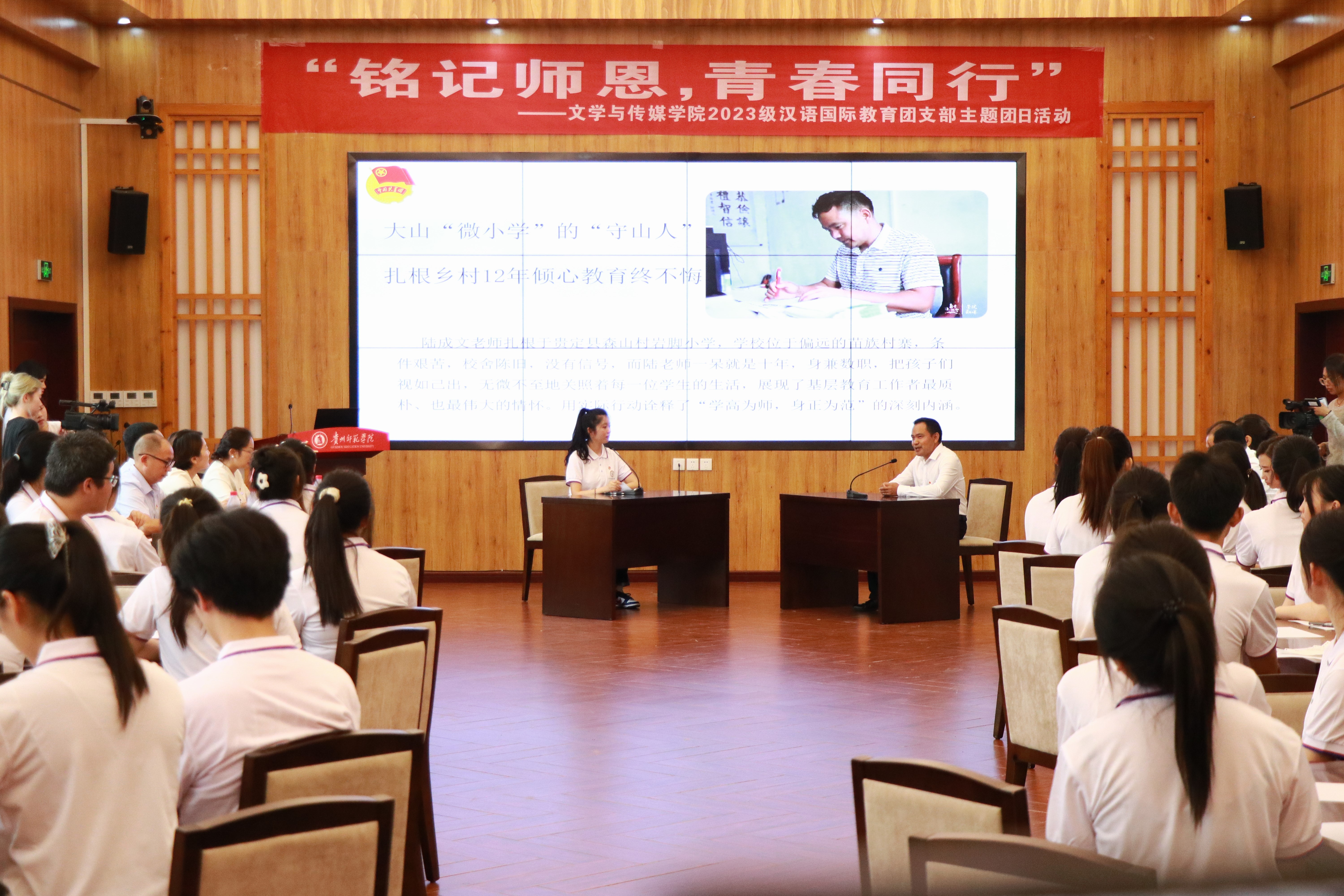 为庆祝中华人民共和国成立75周年,贯彻落实党的二十届三中全会精神和习近平总书记在全国教育大会上的讲话精神,弘扬尊师重教的传统美德,yl8858永利集团2023级汉语国际教育团支部于9月29日开展了“铭记师恩,青春同行”的主题团日活动,邀请了全国模范教师共话教育强国梦,献礼祖国华诞。学校党委书记石培新出席了本次主题团日活动并作总结讲话。校团委书记周煜、学院全体班子成员及专职辅导员参加了活动。