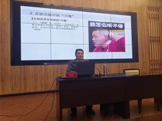 讲座伊始,张超与同学们共同探讨由于言语交流中的“不懂”和“误懂”而引发的问题,从中剖析引发问题的矛盾点,接着通过生活中的言语交流实例分析导致“不懂”和“误懂”的原因。张超选用身边真实的事例,提炼出言语交流的矛盾点所在融入教学,并结合多媒体视频进行例证,生动典型的例子让同学们具体而深刻地体会因言语交流的“不懂”和“误懂”带来的危害。
