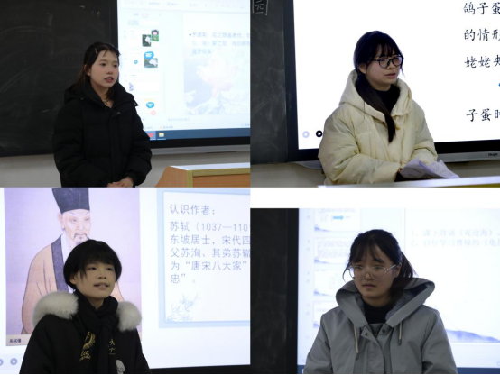 活动伊始,杨波院长致辞。他强调,本次活动从策划到实施历时两个月,其目的是为了让优师生精心准备,多次打磨,反复思考,进一步提升师范生教育教学能力,夯实教学基本技能,为下学期即将开始的教育实习打好基础。教学展示活动正式开始,高洁、陈丹丹、朱强莹、吴亚星和裴清娴五位同学依次走上讲台,分别讲授周敦颐《爱莲说》、苏轼《记承天寺夜游》、曹操《观沧海》、曹雪芹《刘姥姥进大观园》和刘禹锡《陋室铭》。她们在课堂上教态自然大方,教学语言丰富流畅,朗读范读声情并茂。随后,杨慧琴、刘佳人和徐雯雯老师分别对五位同学的讲课内容、课堂展示进行精到细致的点评,引导她们要立足新课标继续优化教学设计,基于情境设计任务,有效组织语文活动,注重与台下学生的互动和交流,关注学习效果。
