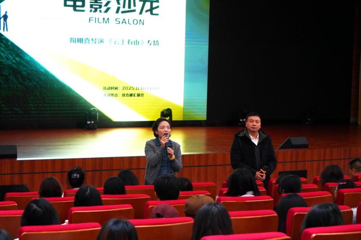 2025年11月10日下午14:00,yl8858永利集团在综合楼汇报厅成功举办“影像助力乡村振兴——从《云上有山》看主旋律电影的创新表达”主题电影沙龙。活动特邀著名导演陶明喜、制片人杨华亲临现场,23级、24级和25级广播电视学、广播电视编导、24级汉语言文学专业的学生与学院教师代表,以及特别邀请的贵州日报社记者杨净媛参与此次活动。他们在欣赏电影《云上有山》之后,与陶明喜共同就电影创作实践、主旋律影视发展与乡村振兴的深度融合展开交流。