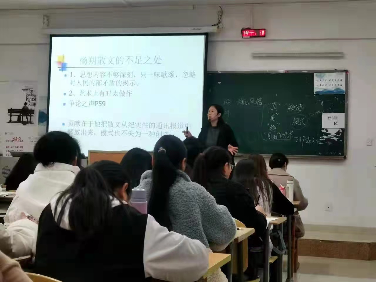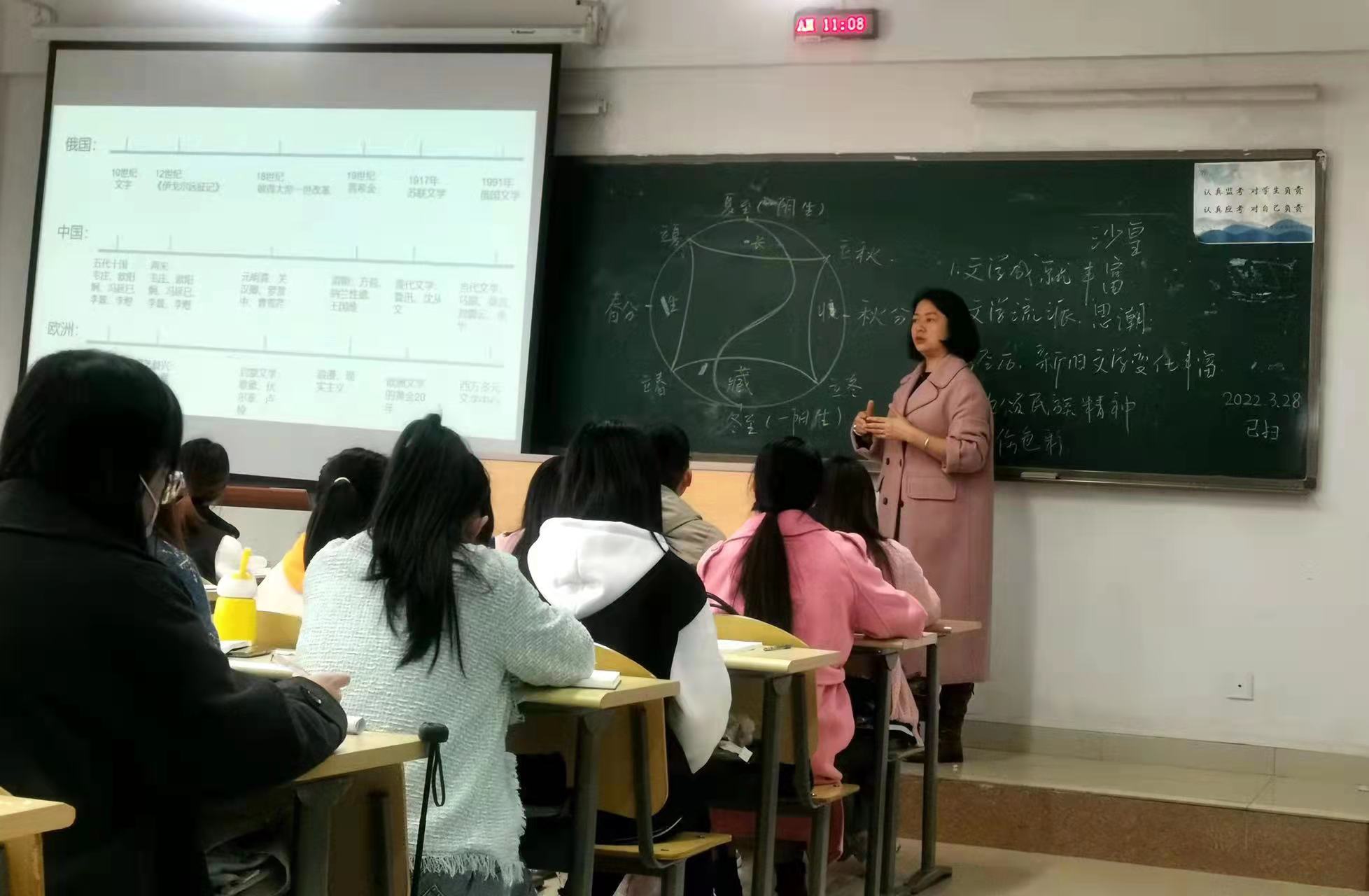 李楠老师的《中国当代文学》经过精心的设计,围绕“十七年文学——散文”的主题,引导学生学习新中国成立后“十七年文学”时期散文,从散文的定义切入,把握“十七年文学”时期散文整体风貌,分析了“散文三大家”创作的特色与局限。教学思路清晰,训练扎实有效。刘佳人老师带来的精彩授课“20世纪俄苏文学概述”,由一段舒缓的轻音乐引领同学们走入俄国文学的世界,通过全球视野、比较视野,结合图表让同学们对20世纪俄国文学“年轻而厚重”的气质有了深入了解和掌握。