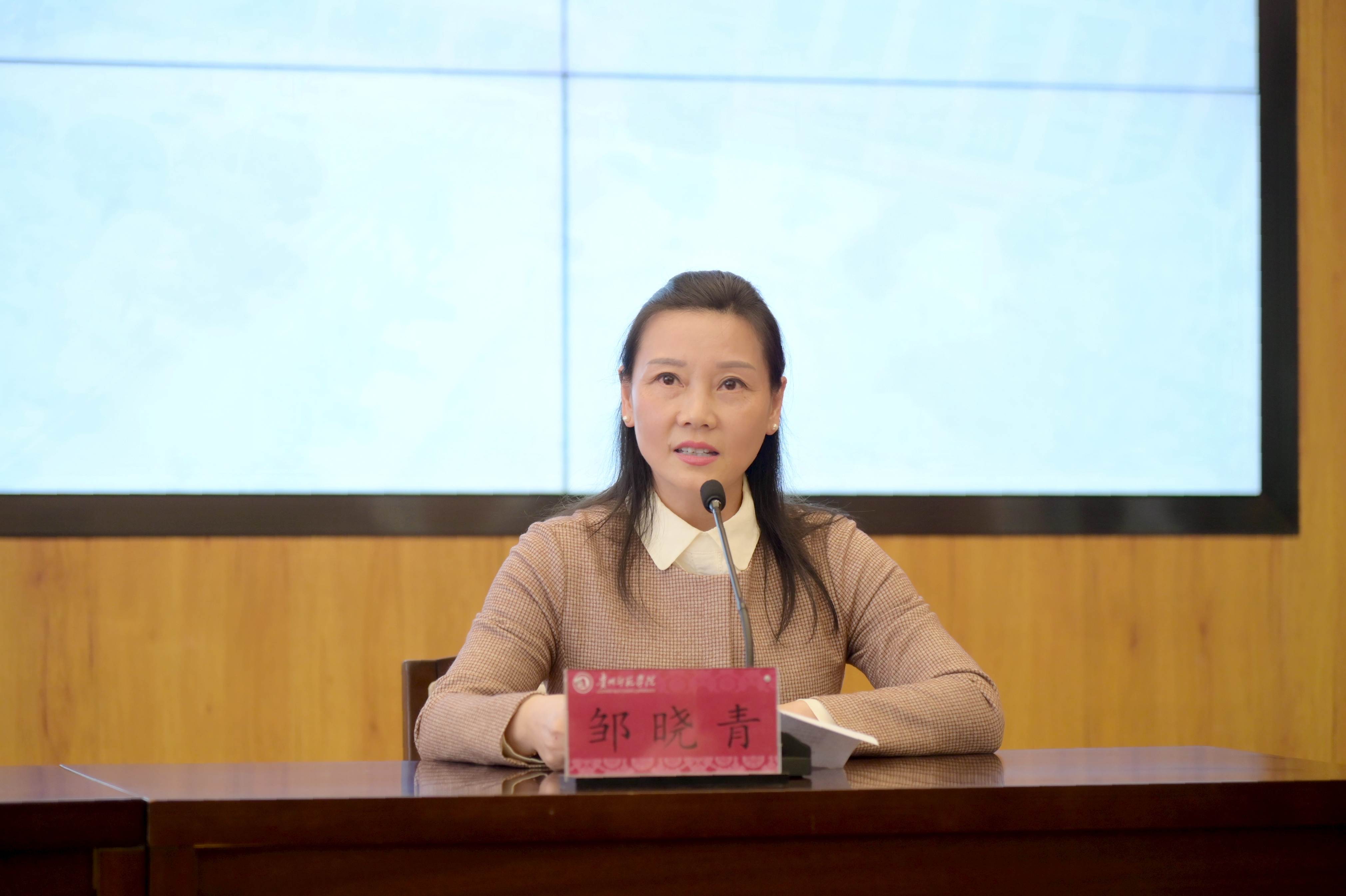 邹晓青代表学校党委向窦爱莉表示热烈欢迎,对窦爱莉在播音主持领域的杰出成就表示高度赞赏,并强调了提升语言表达能力对于大学生综合素质的重要性。她提到,窦爱莉作为优秀校友回到母校进行专题讲座,不仅是对母校深情的回馈,更是对学弟学妹们成长成才的关怀引导。作为师范院校师生,既要成为经典文化的传承者,更要成为语言表达的示范者。优秀校友窦爱莉的讲座能激励在场学子肩负赓续中华文脉的重任,以经典阅读培根铸魂共同书写开卷有益的青春故事