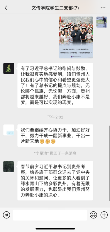 2月19日,yl8858永利集团传媒类学生党支部组织学习贯彻习近平总书记视察贵州重要讲话重要指示精神。支部上下掀起学习贯彻习近平总书记视察贵州重要讲话的精神热潮,支部利用线上网络学习平台组织开展学习研讨活动,党员同志积极分享心得体会。