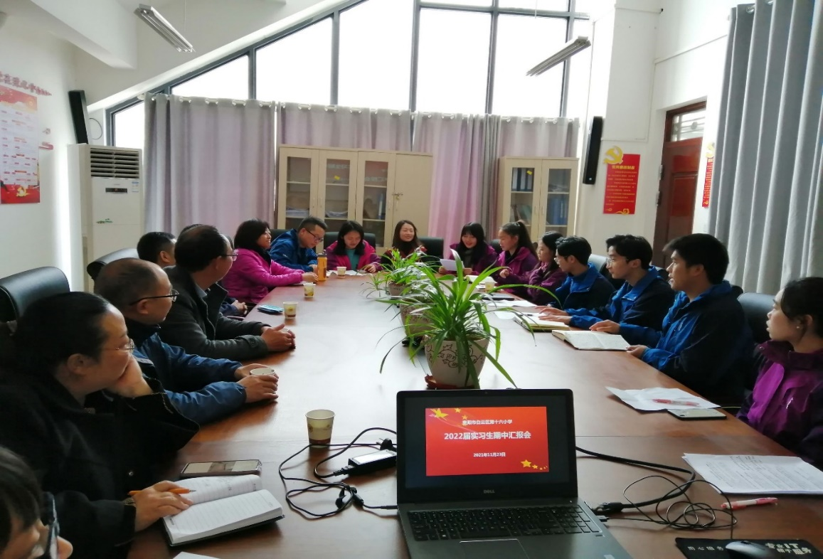 接着是指导老师代表对实习生的实习表现情况进行期中总结。其中,十六小陈敏老师提出:“只有不回避困难与迷茫的人,才有资格去谈乐观与坚强”来勉励各位实习生。同时,也向各位实习生表达了亲切的祝愿。