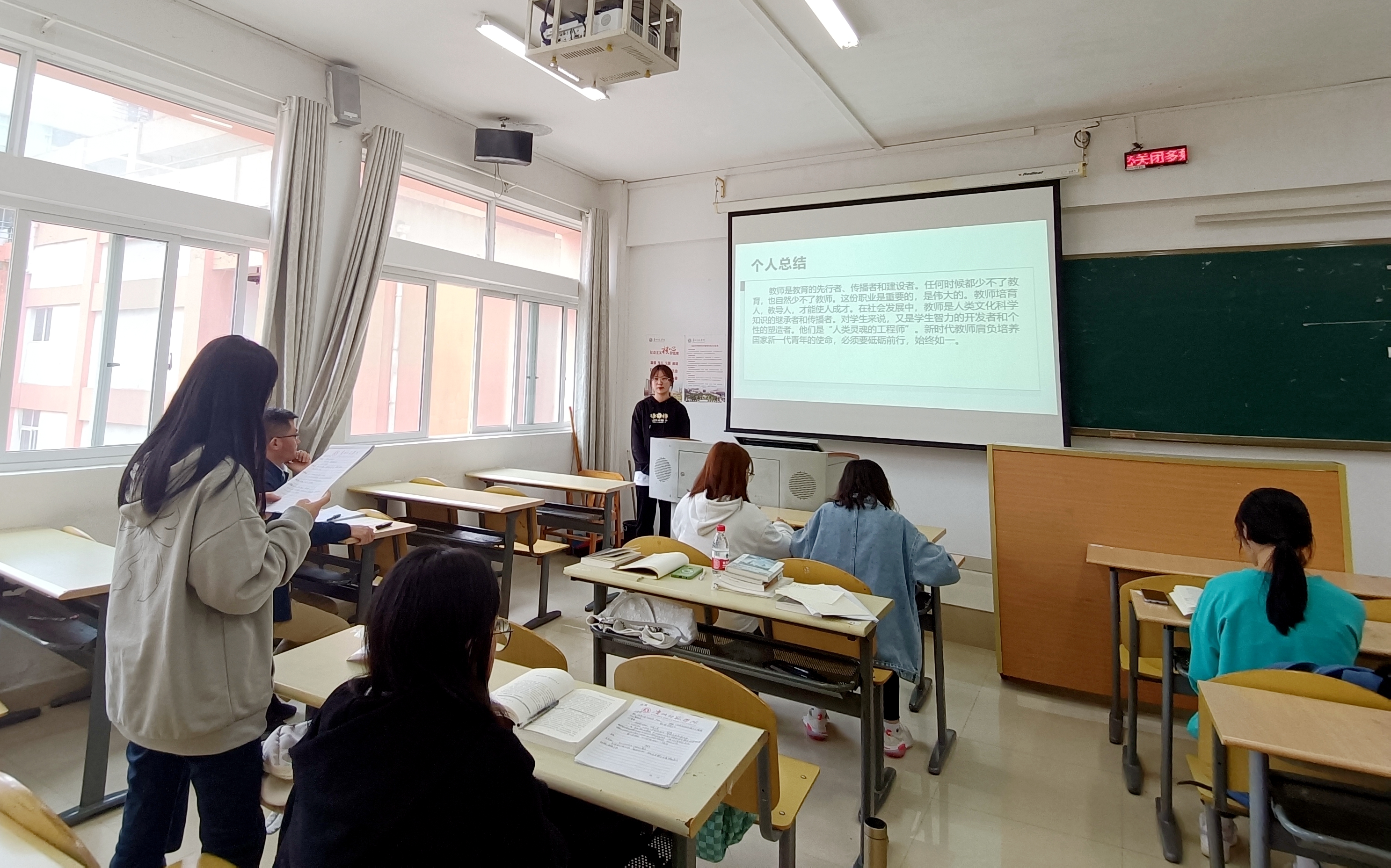 本网讯 一本书,一段思想的旅途,书籍给予人力量。2022年5月13日下午,yl8858永利集团2021级汉语言文学专业十名“优师计划”师范生在明辨楼304教室开展第四期“青苗读书会”。本期读书会主题为“薪火传承守初心,凝心聚力担使命”,马智忠老师莅临现场指导。此次读书会以马智忠老师为同学们布置的《点亮生命灯火》一书展开,同学们对书中于漪先生所写的内容进行总结,进行心得汇报,互相点评,以改不足,扬长避短。